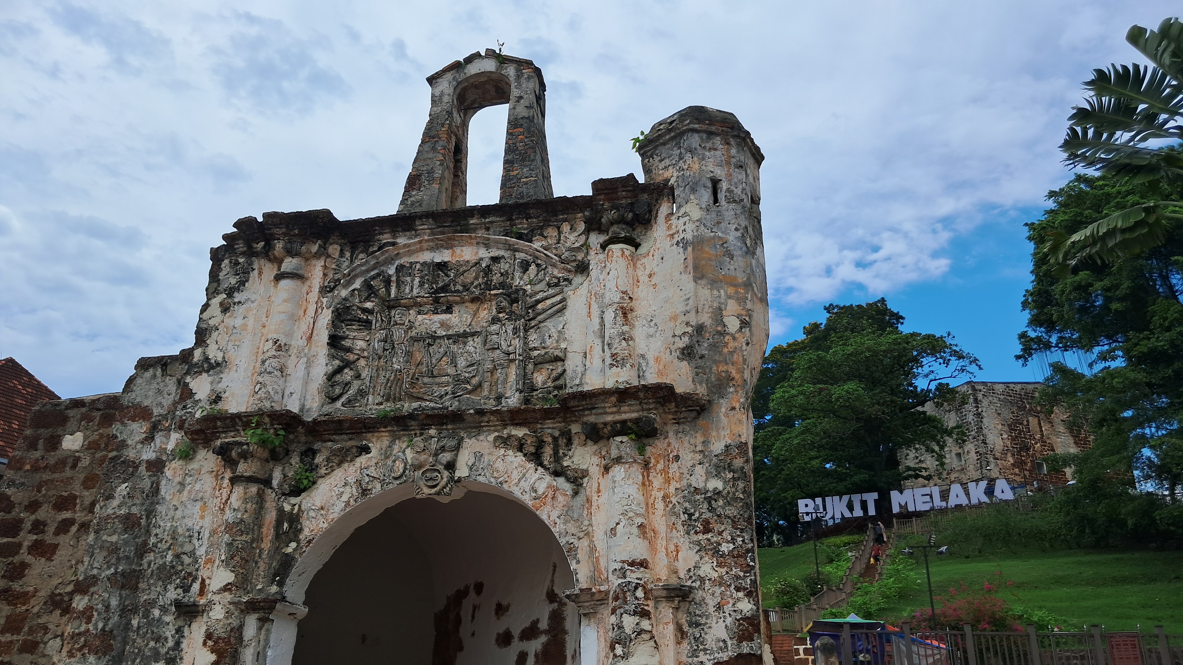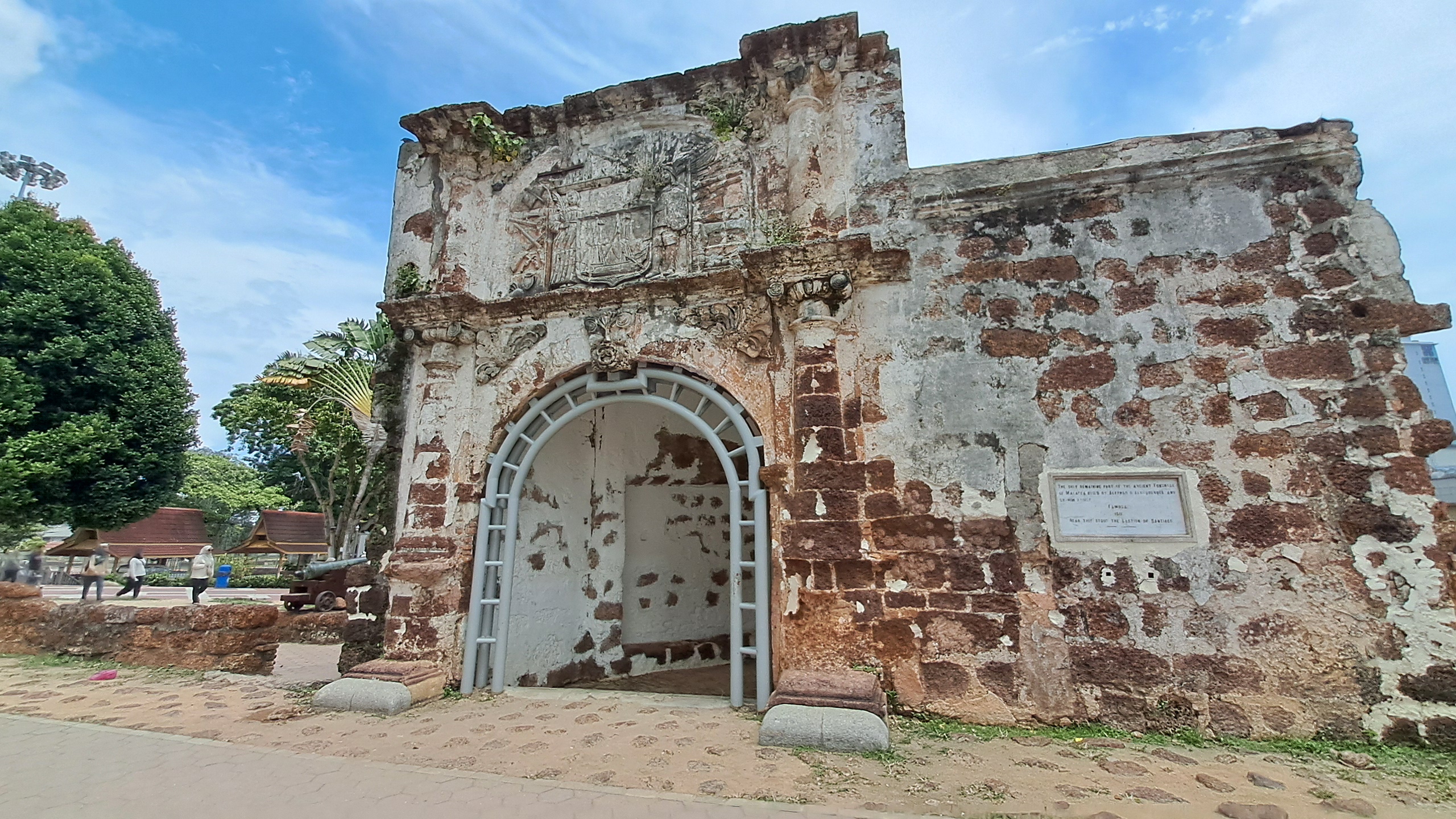 에이 파모사 요새(산티아고 요새)는 1512년에 말라카 해협을 지키기 위해 포르투갈이 만든 요새입니다. 포르투갈의 수호신인 성 야곱을 가리키는 산티아고라는 이름이 붙여졌고 예전에는 난공불락이었으나 네덜란드와 영국군의 침공으로 부서졌으며 1670년 네덜란드인에 의해 복원되었으나 지금은 성의 정문만 남아 있습니다. 주변에는 당시 사용한 구형포들이 남아 있습니다.